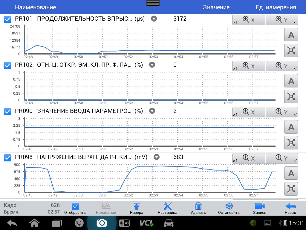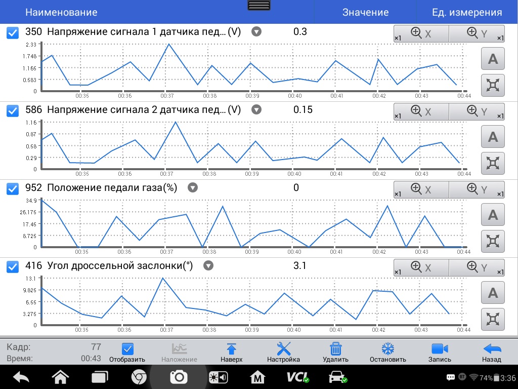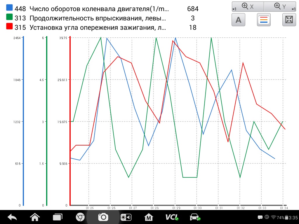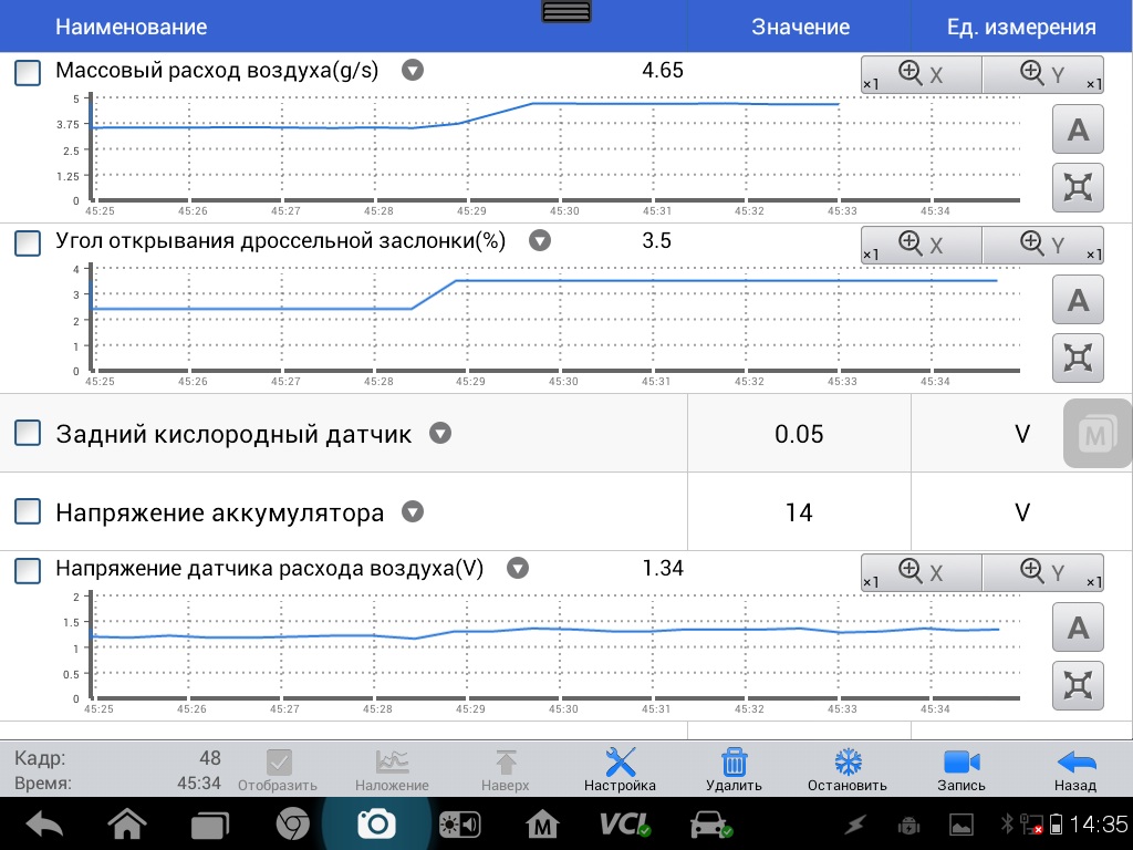 - Часть параметров необходимо накладывать в графике для наблюдения изменений относительно друг друга (например, массовый расход воздуха и обороты двигателя).