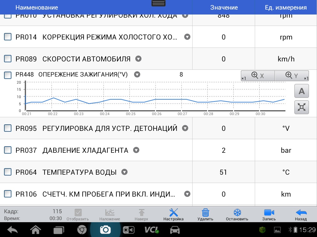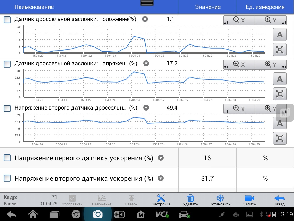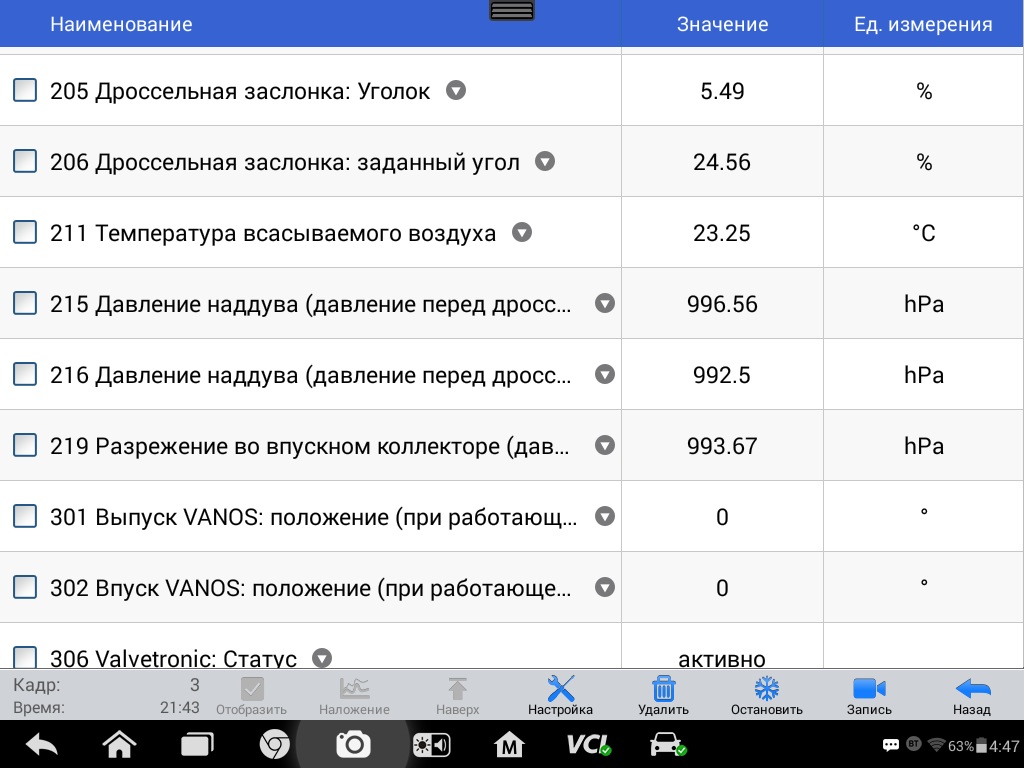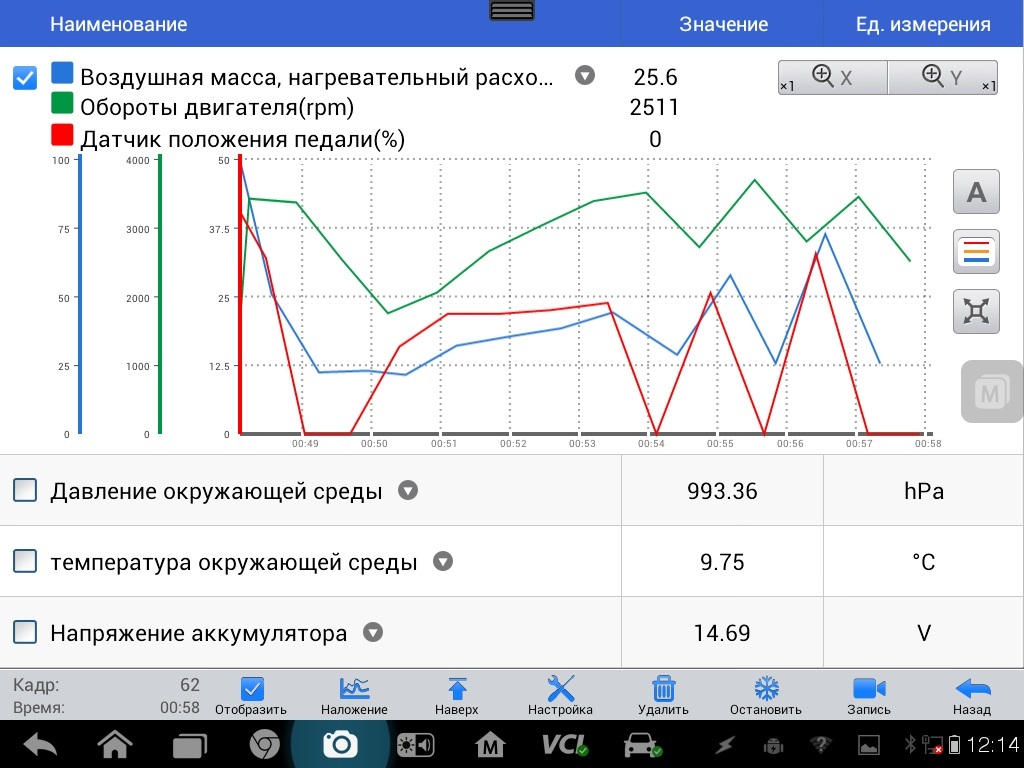- Часть параметров необходимо накладывать в графике для наблюдения изменений относительно друг друга (например, массовый расход воздуха и обороты двигателя).